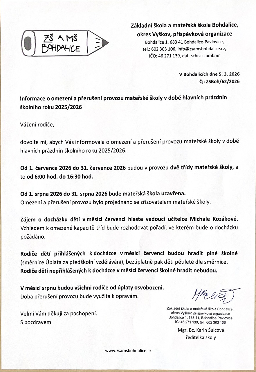 POZOR! HROMADNÉ ROZHODNUTÍ O PŘIJETÍ K PŘEDŠKOLNÍMU VZDĚLÁVÁNÍ NALEZNETE V SEKCI ÚŘEDNÍ DESKA!
